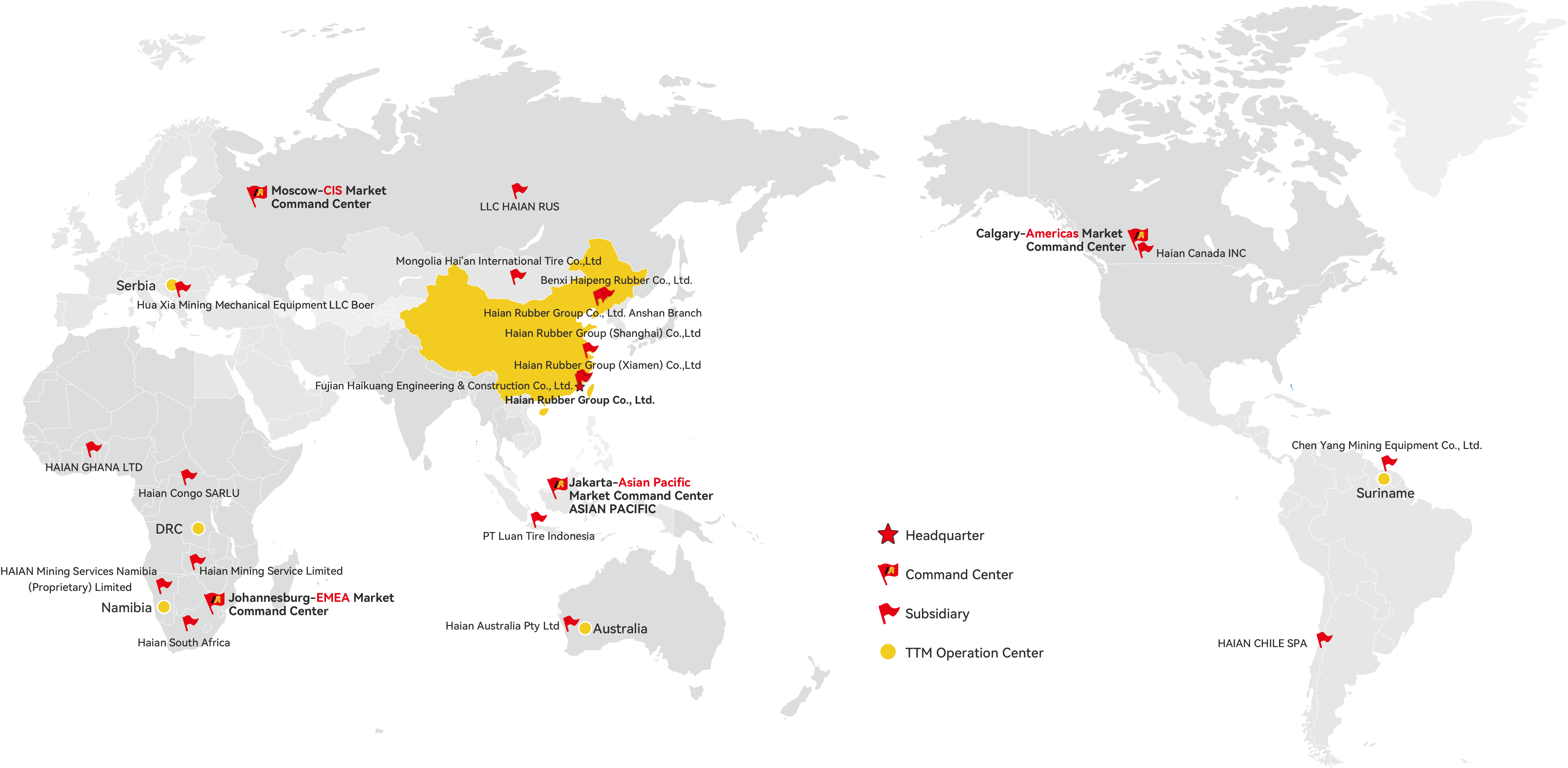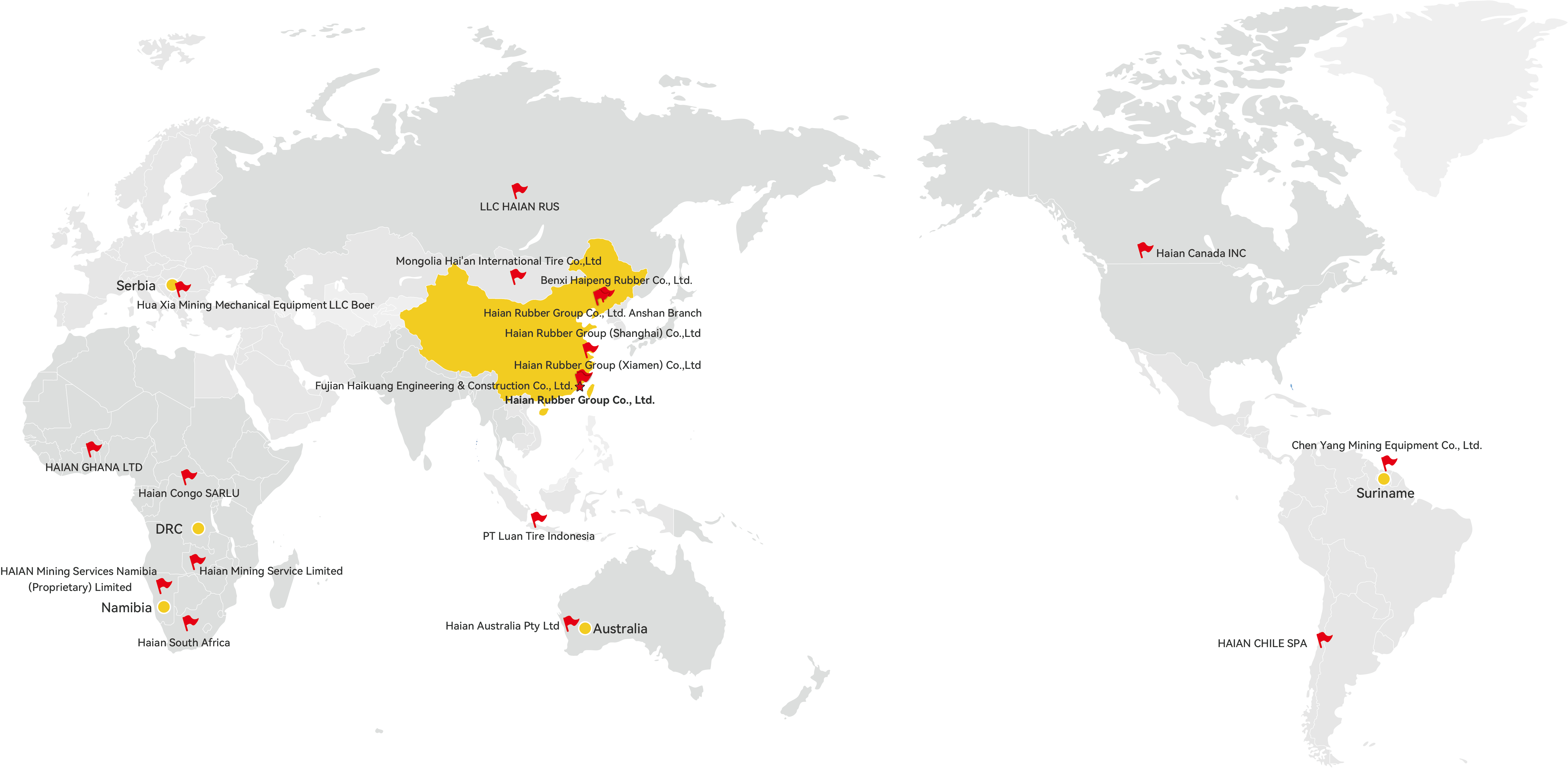 از سال 2007، هایان گروپ به سرعت توسعه یافته و "خدمات قراردادی یک مرحلهای با هزینه سهمیهبندی شده برای مصرف لاستیکهای OTR" را با بیش از ده شرکت معدنی داخلی به انجام رسانده است که نیازهای ساخت و ساز معادن بزرگ مقیاس و پروژههای کلیدی در چین را تضمین کرده است. در عرصه بینالمللی، ما روابط همکاری بلندمدتی با گروههای بزرگ معدنی جهانی و گروههای پیمانکاری معادن برقرار کردهایم. در حال حاضر، لاستیکها و خدمات هایان گروپ در سراسر جهان، از جمله اوکراین، صربستان، اندونزی، مغولستان، قزاقستان، استرالیا، کانادا، سورینام، برزیل، مکزیک، شیلی، کلمبیا، آفریقای جنوبی و دهها کشور دیگر حضور دارد. ما به هر مشتری خدمات عالی ارائه میدهیم، به صدای آنها گوش میدهیم و روابط خوبی برقرار میکنیم.